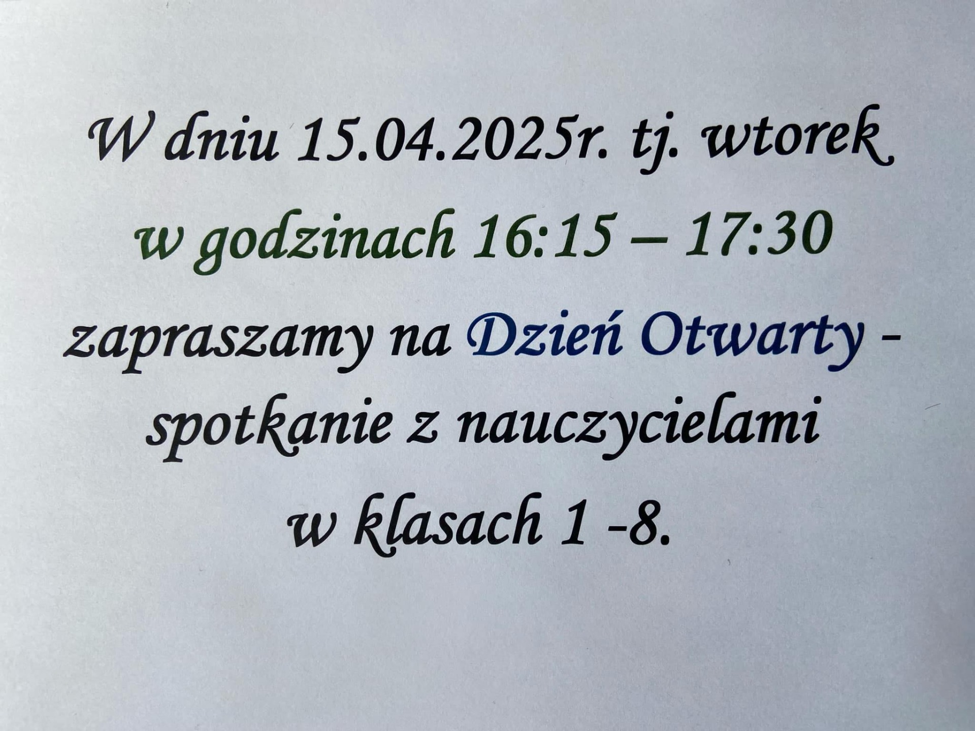 W dniu 15 kwietnia 2025 r. tj. wtorek w godzinach 16:15 - 17:30 zapraszamy na Dzie艅 Otwarty - spotkanie z nauczycielami w klasach 1-8 馃槉