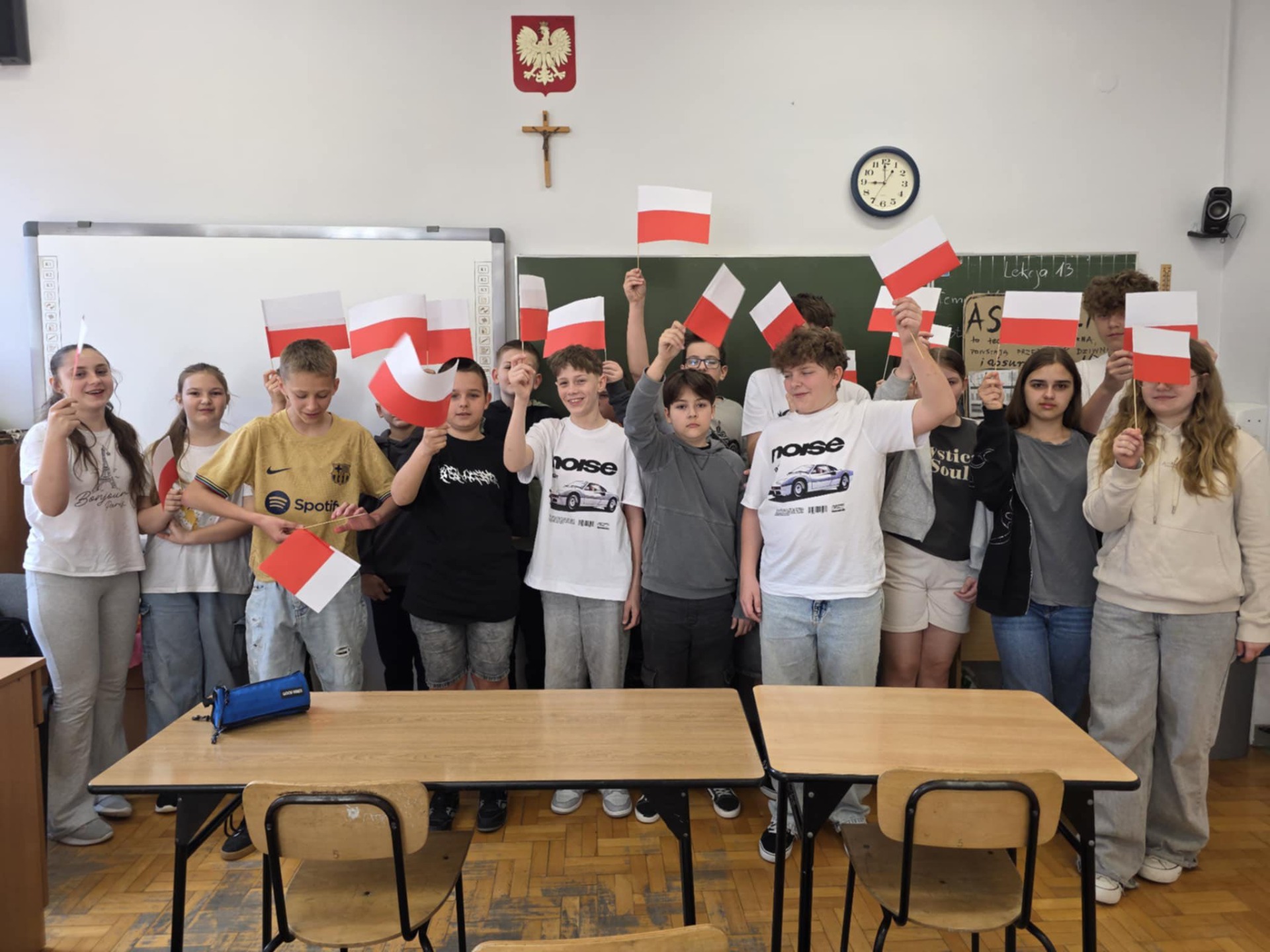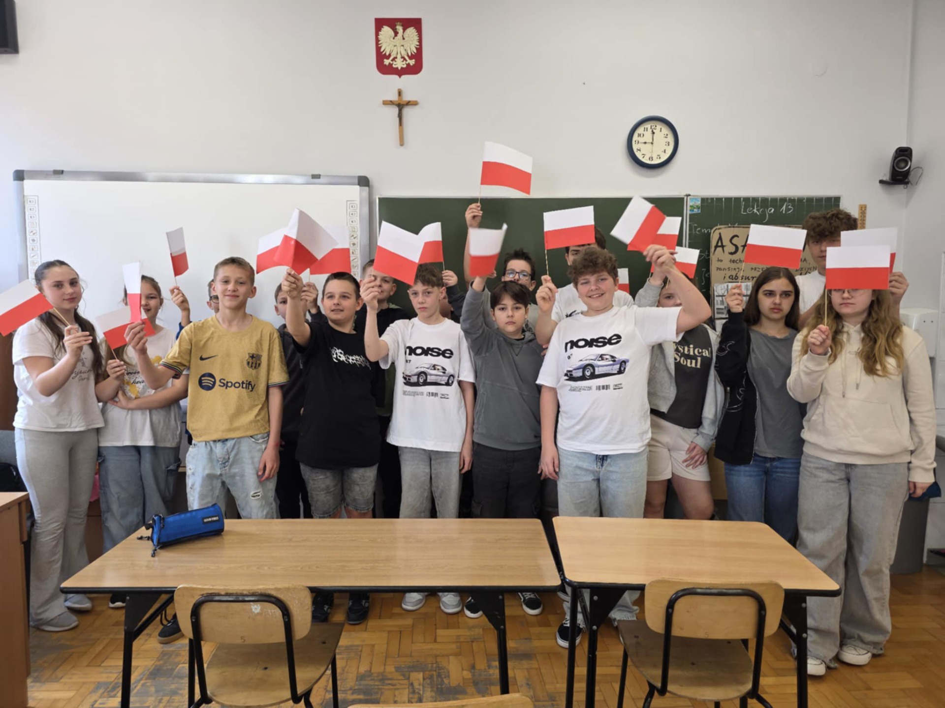 Na lekcji plastyki uczniowie klasy 6b z zaangażowaniem przygotowywali flagi Polski, aby wspólnie uczcić Święto Konstytucji 3 Maja. W atmosferze pełnej patriotyzmu, uczniowie wykazali się starannością i kreatywnością, tworząc symbole narodowe, które miały ozdobić gazetkę oraz wystrój sali na uroczysty apel. Do wykonania flagi uczniowie używali białego i czerwonego papieru technicznego, kleju oraz patyczków do trzymania flagi. Każdy z uczniów dbał o odpowiednie proporcje i kolory, przypominając sobie, jak ważne znaczenie mają nasze barwy narodowe. Niektóre flagi ozdobione zostały także rysunkami orła białego lub napisem "3 Maja", co dodatkowo podkreślało świąteczny charakter pracy.Podczas zajęć przypomnieliśmy sobie również o najważniejszych świętach majowych: Święcie Pracy (1 maja), Dniu Flagi Rzeczypospolitej Polskiej (2 maja) oraz o Święcie Konstytucji 3 Maja, które jest jednym z najważniejszych wydarzeń w historii Polski.