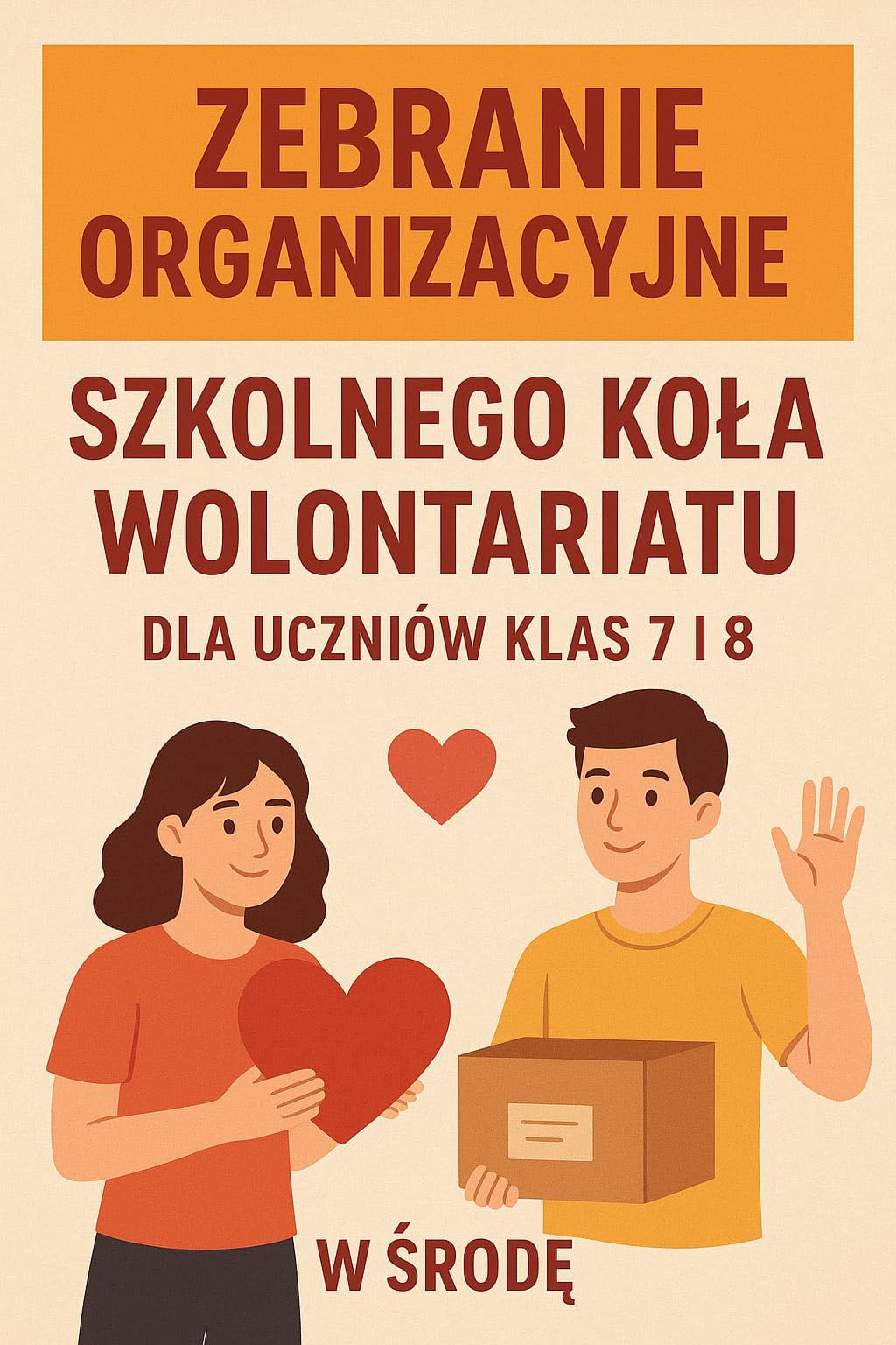 Zapraszam na zebranie organizacyjne Szkolnego Koła Wolontariatu chętnych uczniów klas 7 i 8.