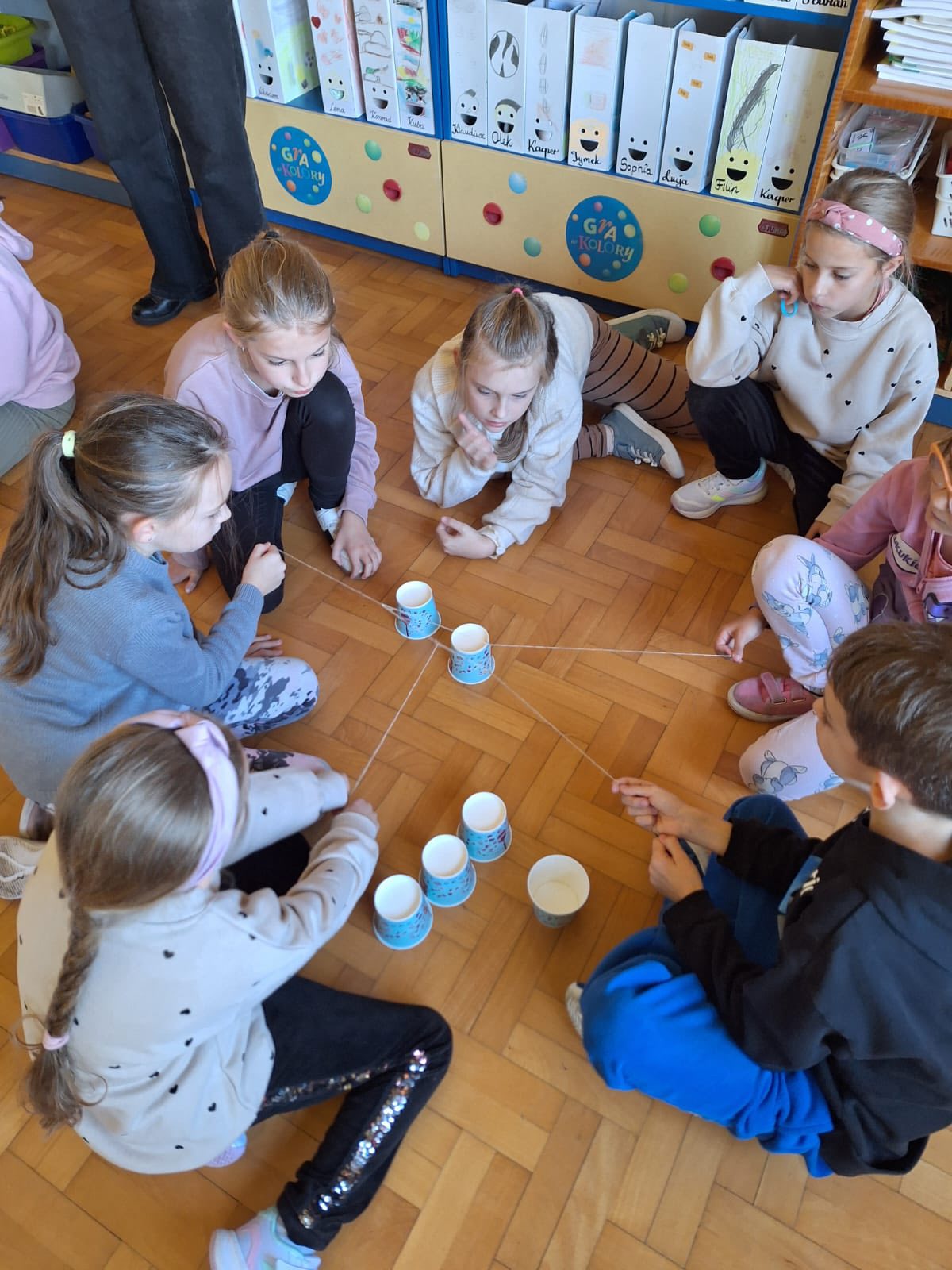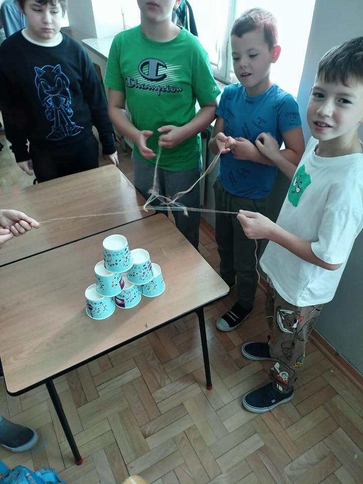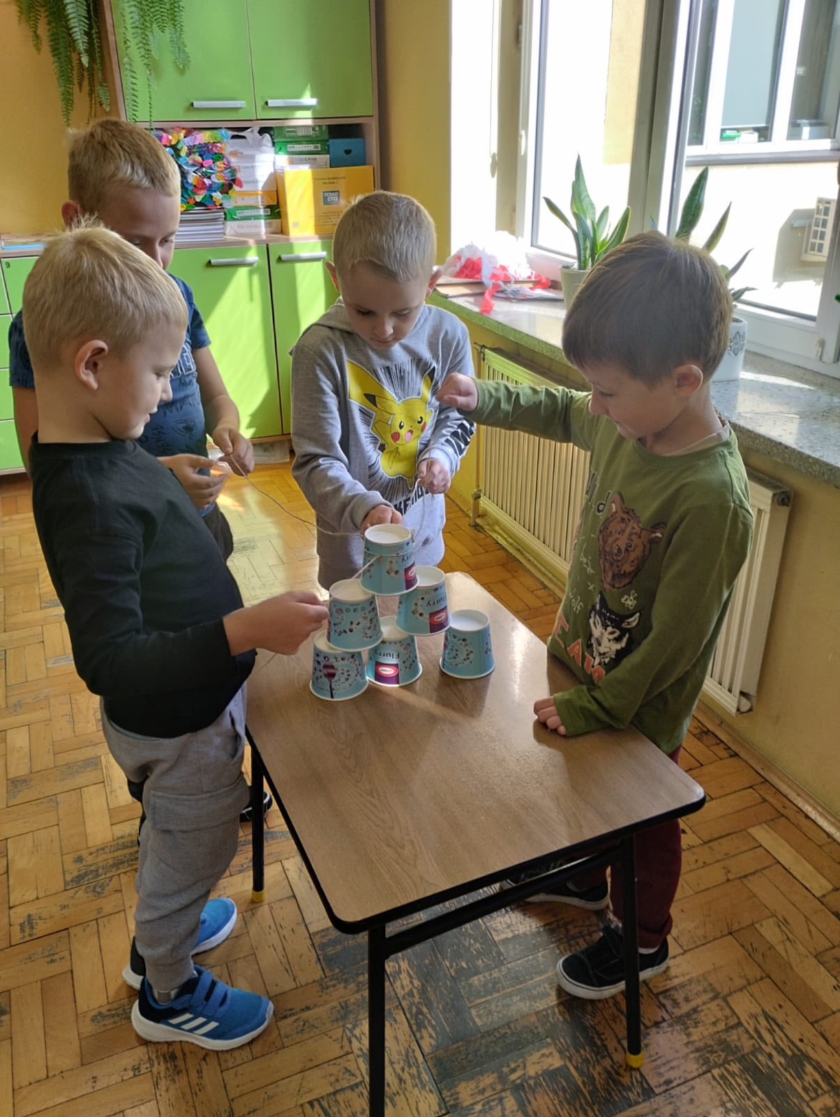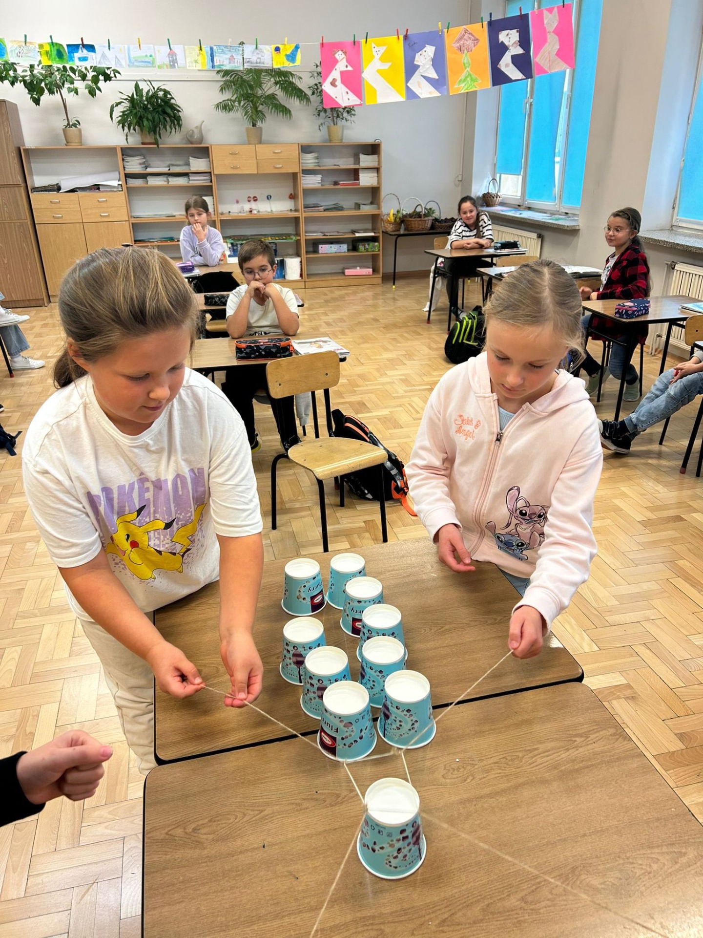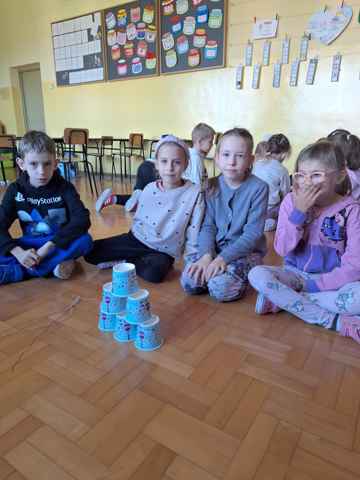 Dzisiejszym hasłem było „Zaufanie i współpraca”. Uczniowie wzięli udział w zabawach manipulacyjnych z kubkami, których celem było wspólne budowanie wieży.
