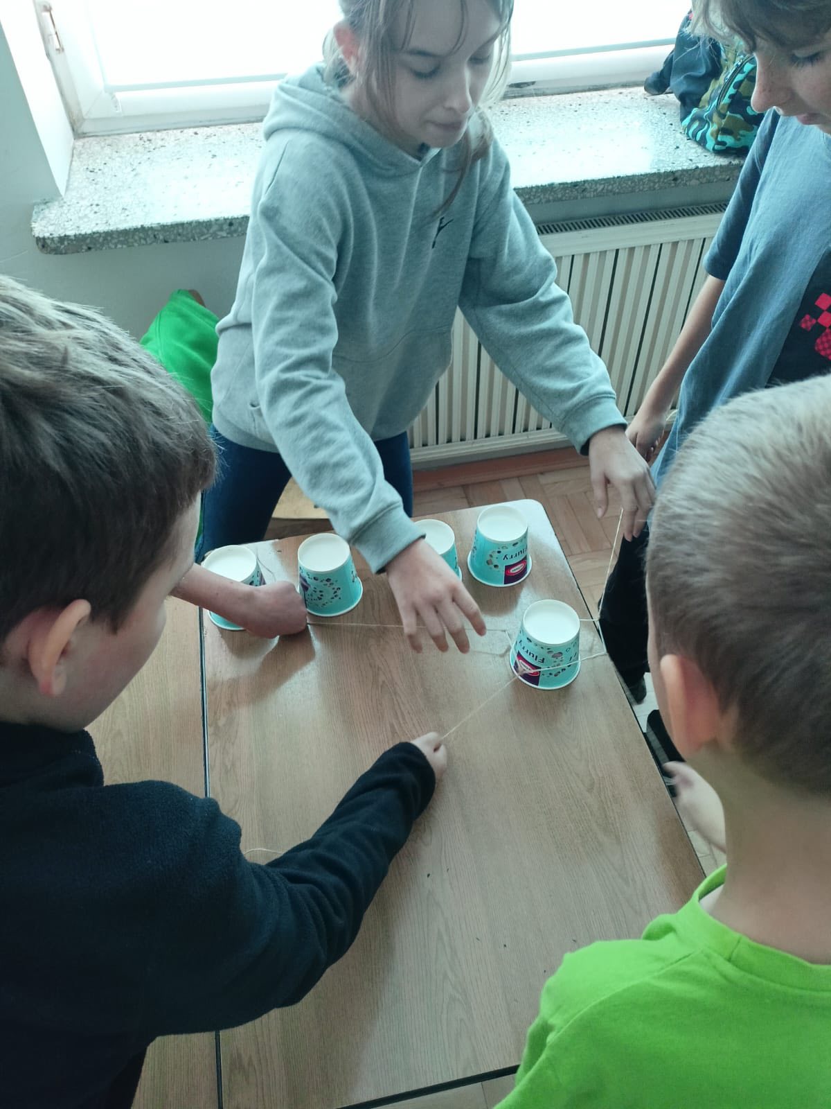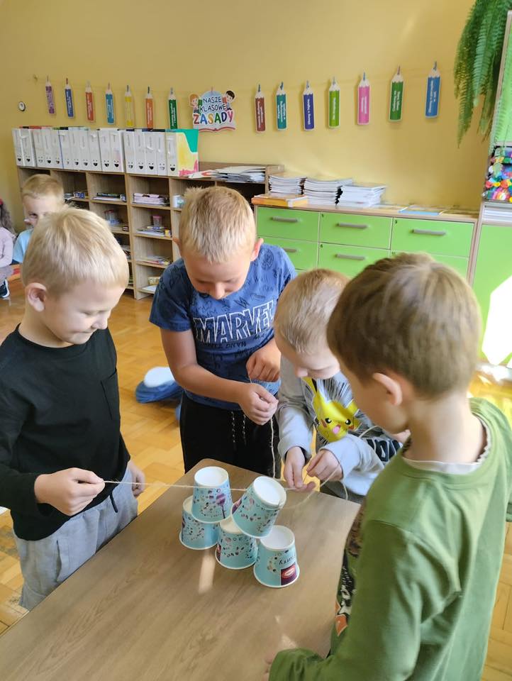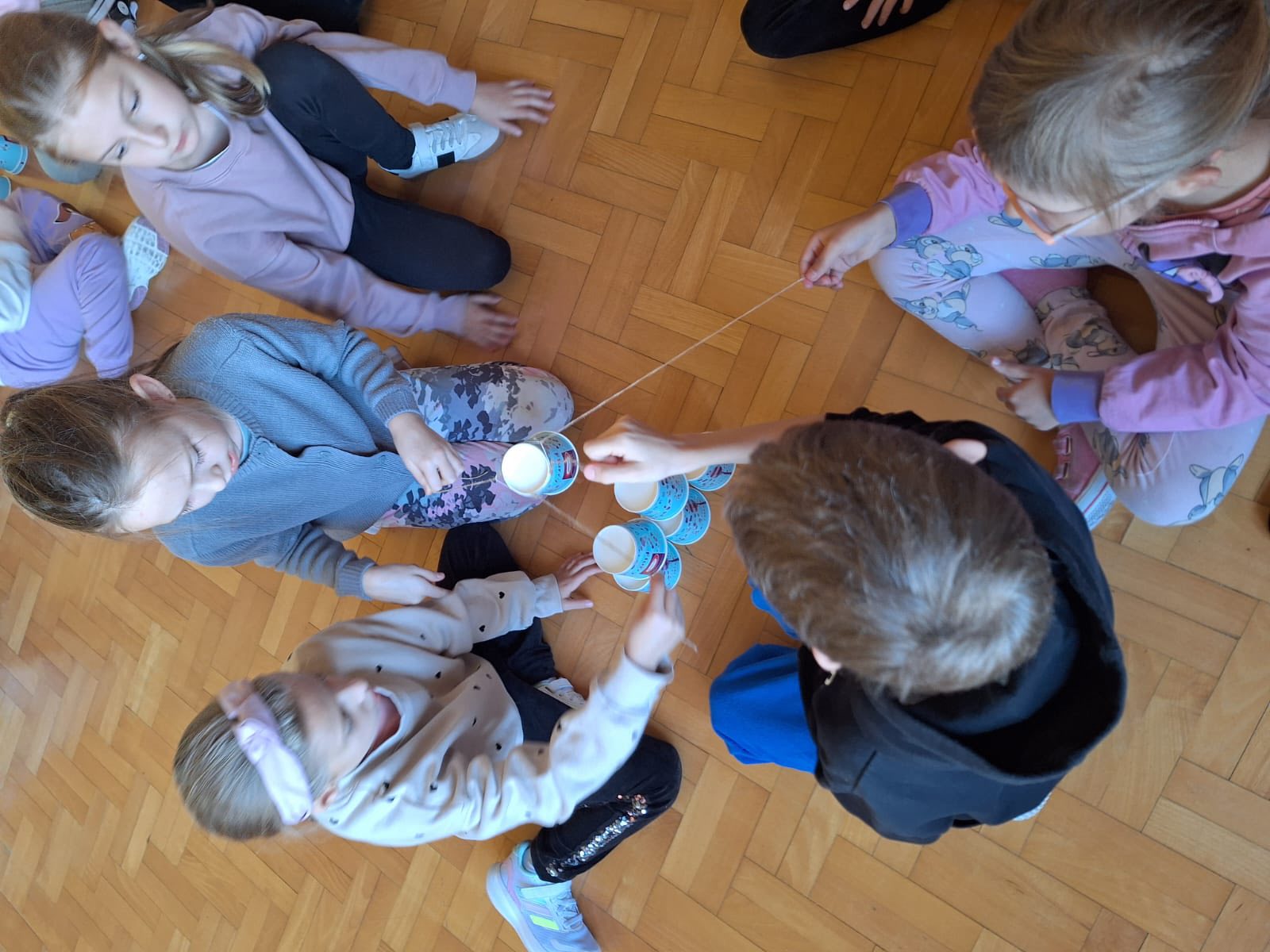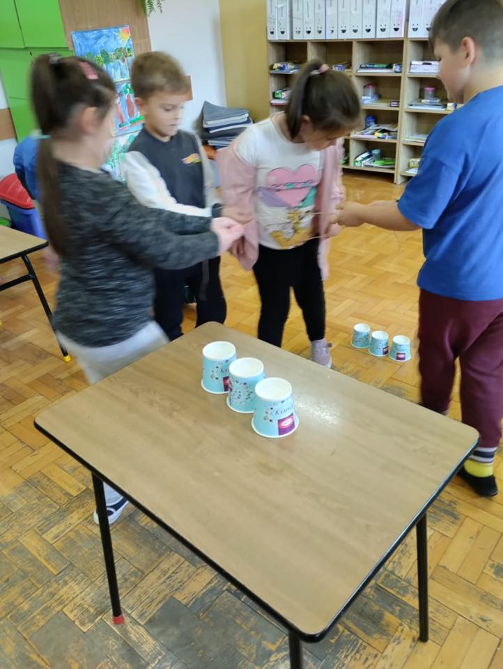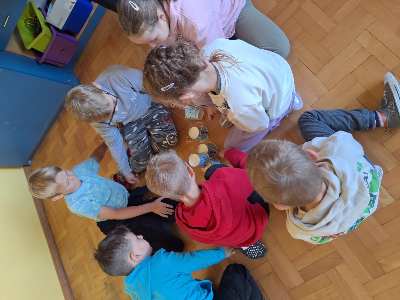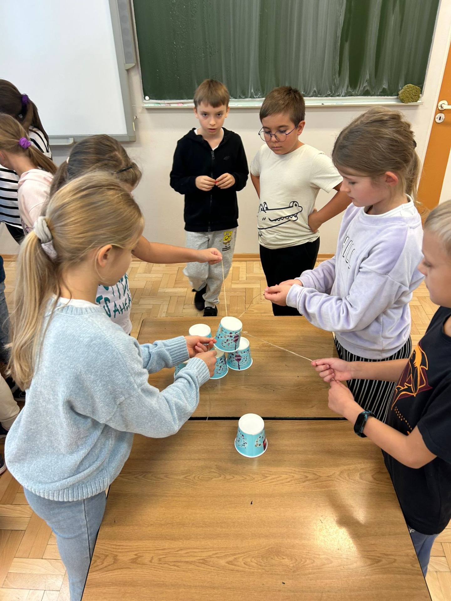 Dzisiejszym hasłem było „Zaufanie i współpraca”. Uczniowie wzięli udział w zabawach manipulacyjnych z kubkami, których celem było wspólne budowanie wieży.
