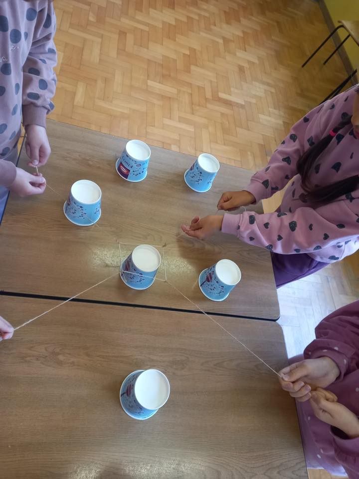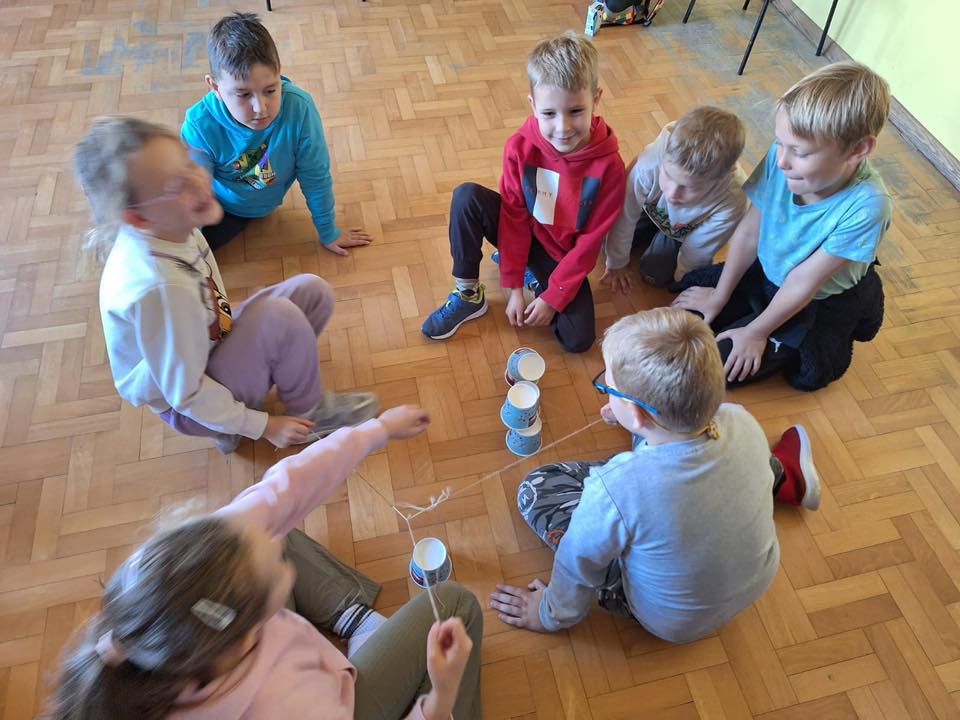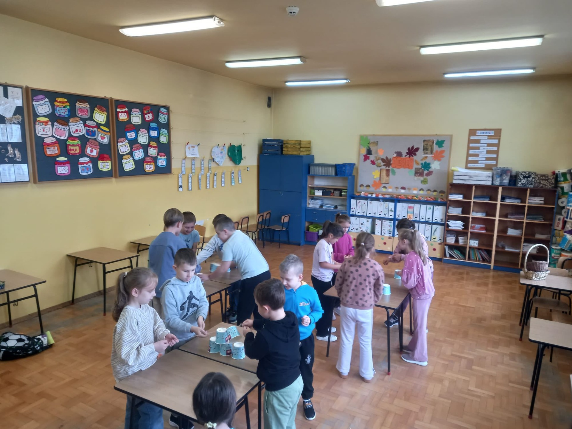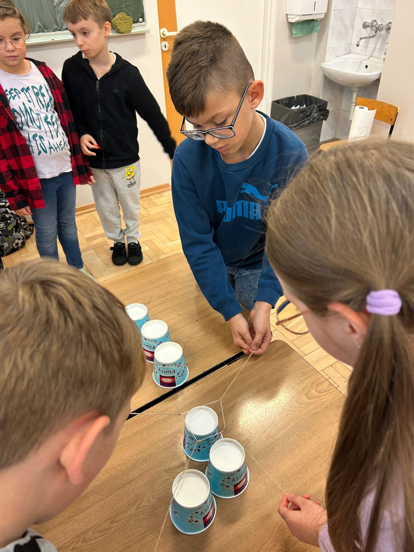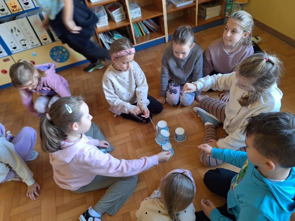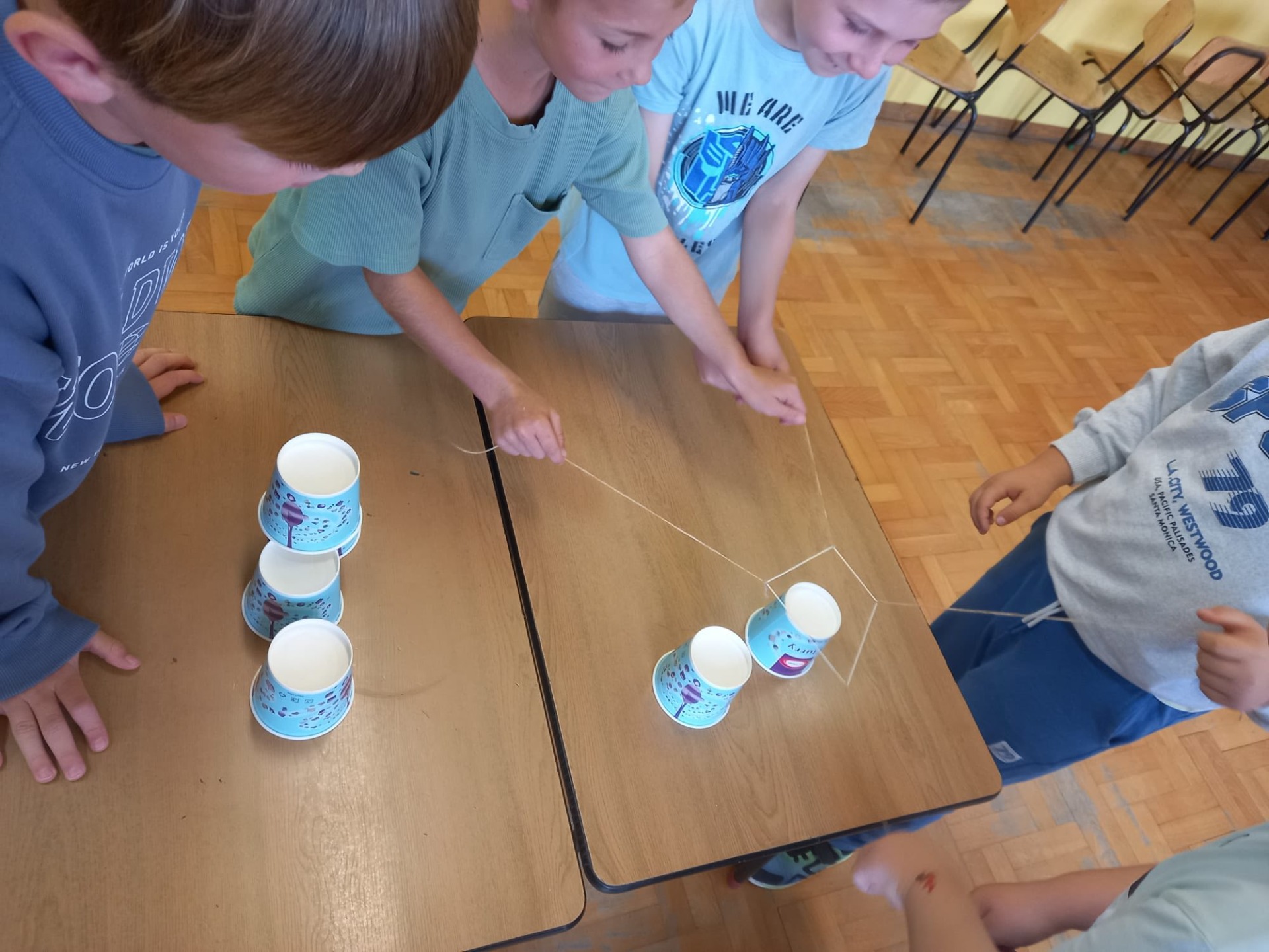 Dzisiejszym hasłem było „Zaufanie i współpraca”. Uczniowie wzięli udział w zabawach manipulacyjnych z kubkami, których celem było wspólne budowanie wieży.