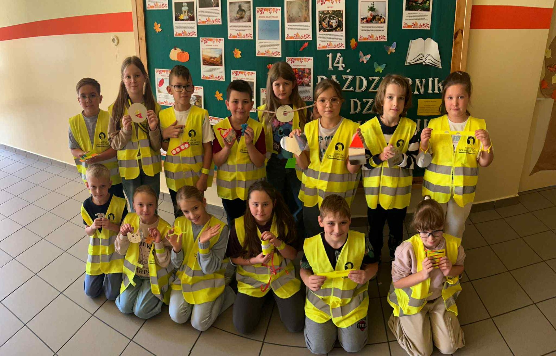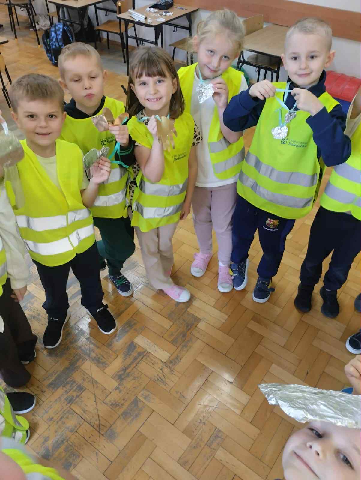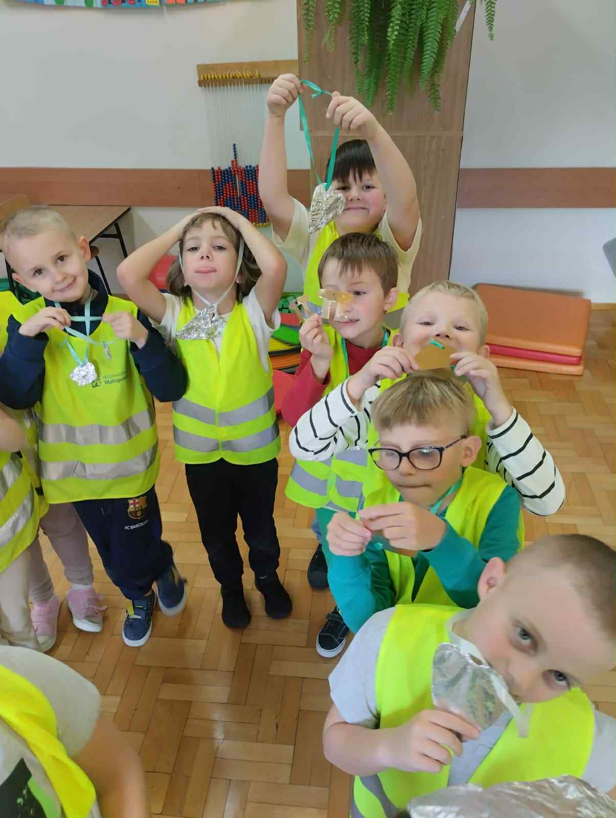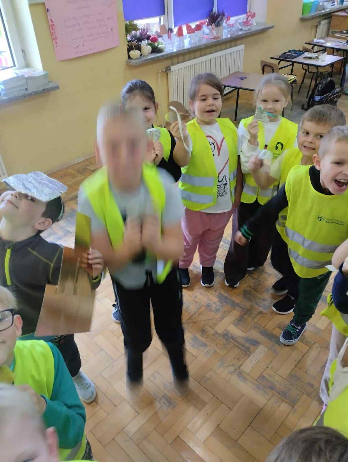 Dziś w klasach I-III obchodziliśmy Odblaskowy Dzień. Już od rana w szkolnych korytarzach było wyjątkowo kolorowo i jasno, a to za sprawą naszych uczniów, którzy z dumą nosili kamizelki odblaskowe i prezentowali odblaski, które na co dzień przypinają do plecaków, kurtek czy rowerów. Podczas zajęć dzieci rozmawiały o znaczeniu noszenia elementów odblaskowych, oglądały materiały edukacyjne i wspólnie zastanawiały się, jak dbać o swoje bezpieczeństwo na drodze, szczególnie jesienią i zimą. Nie zabrakło także muzyki i ruchu - uczniowie z radością śpiewali piosenkę „Znaczki odblaskowe” i uczestniczyli w zabawach muzyczno-ruchowych inspirowanych jej treścią. Uczniowie byli również na spacerze po najbliższej okolicy, gdzie zwracali uwagę na zasady poruszania się po drodze. Na zakończenie dnia uczniowie wykazali się ogromną kreatywnością, projektując i tworząc własne odblaski - kolorowe, błyszczące i przede wszystkim bezpieczne. To był dzień pełen uśmiechu, dobrej zabawy i cennej nauki - bo przecież być widocznym to być bezpiecznym!
