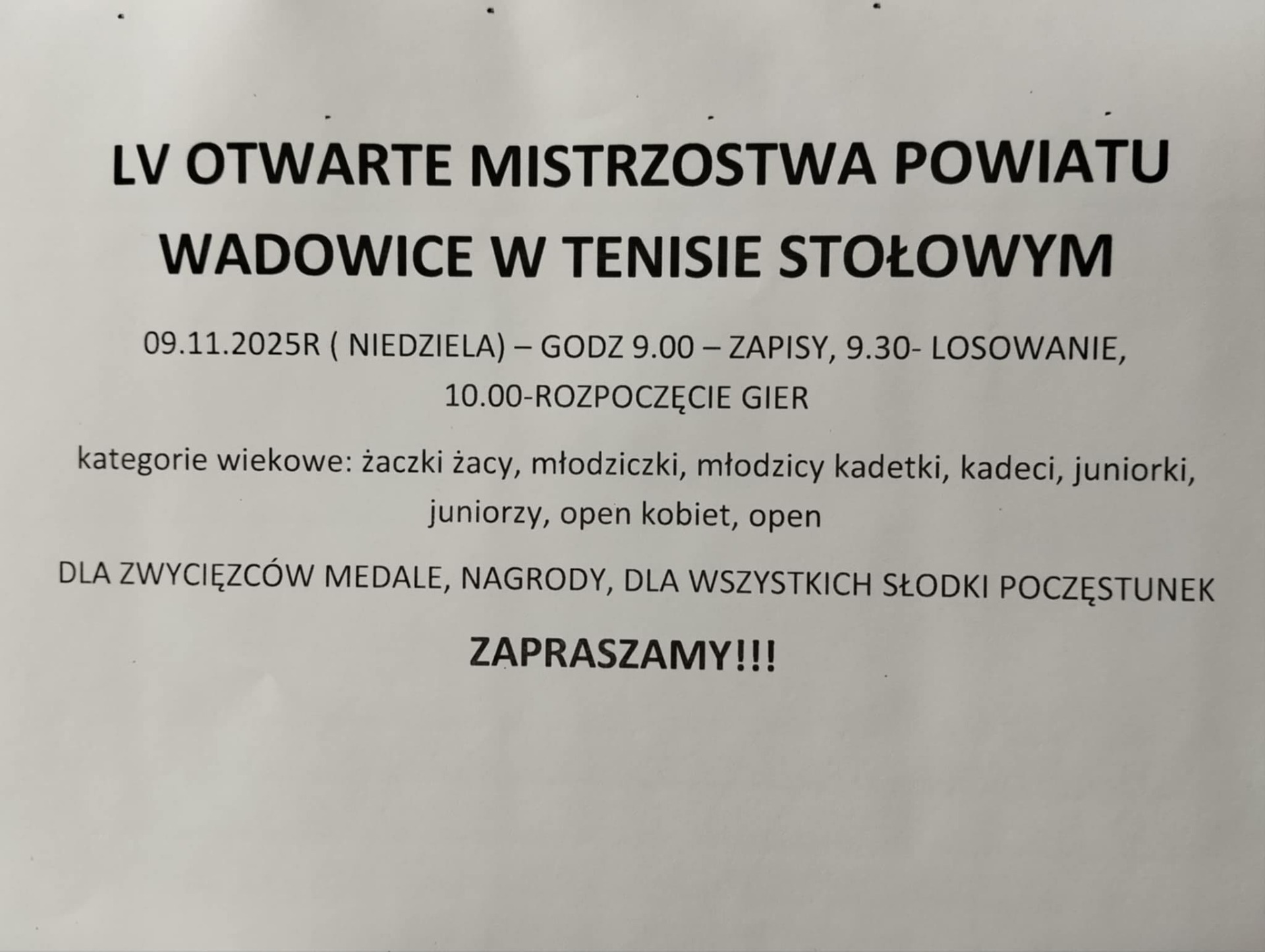 Zapraszamy wszystkich mieszkańców powiatu wadowickiego na LV Otwarte Mistrzostwa Powiatu w tenisie stołowym, które zostaną rozegrane 09.11.2025r w Choczni, ul. Główna 1.