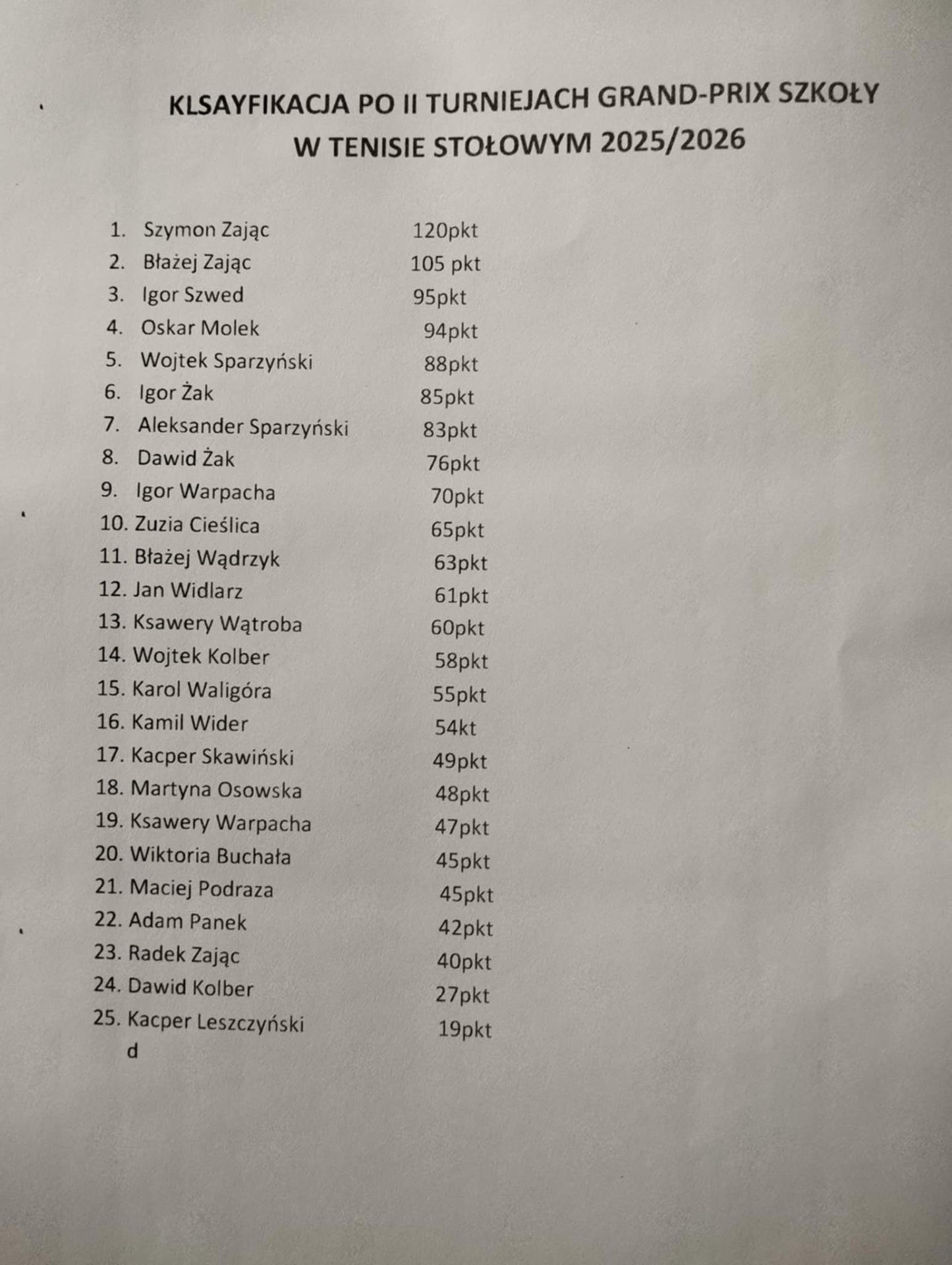 Szymon Zając zwycięzcą II turnieju Grand-Prix szkoły w tenisie stołowym 2025/2026. W dniu 24.11.2025r rozegrano II turniej z cyklu Gran-Prix szkoły w tenisie stołowym 2025/2026.