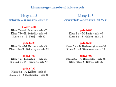 Harmonogram zebrań klasowych 4 i 6 marca...
